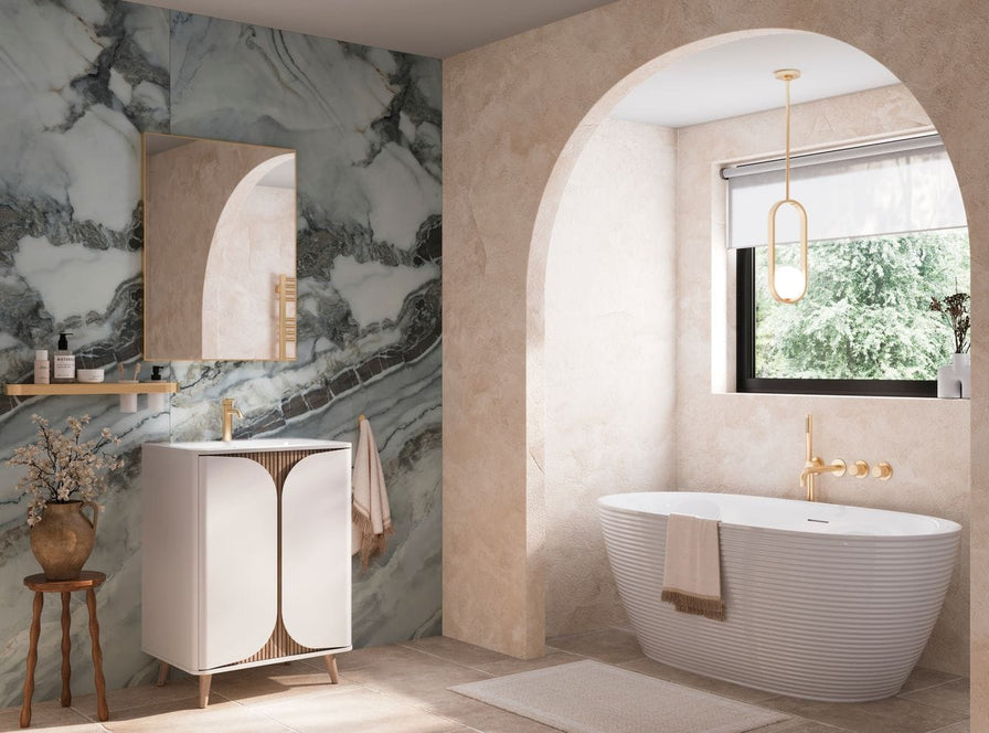wall-mounted toilet, and beautiful brushed brass taps, this collection creates an indulgent, spa-like atmosphere perfect for everyday living.