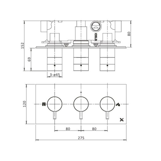 Crosswater MPRO 2 Outlet, 3 Handle Horizontal Concealed Thermostatic Shower Valve