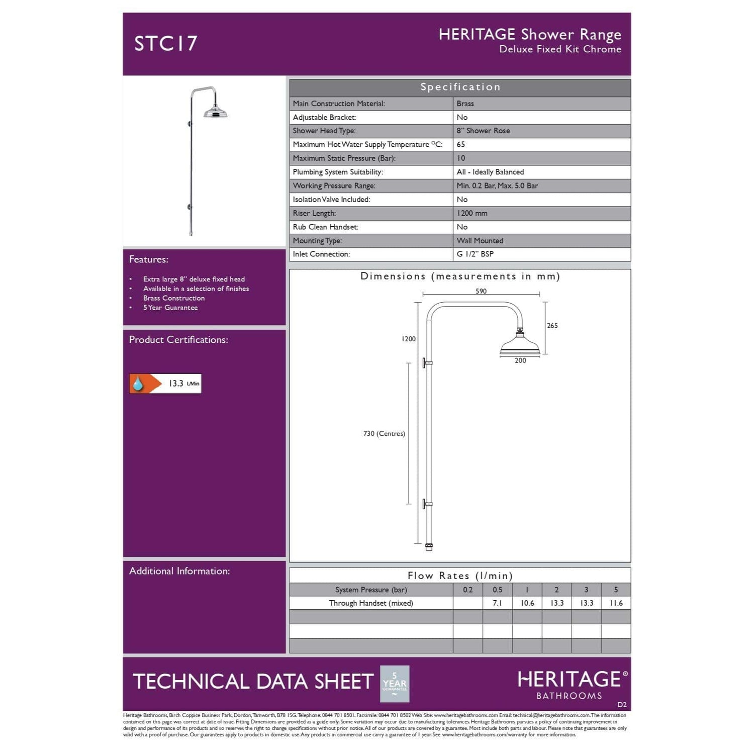 Deluxe fixed riser kit with traditional 8" fixed shower head, made from a high quality brass and finished in chrome.