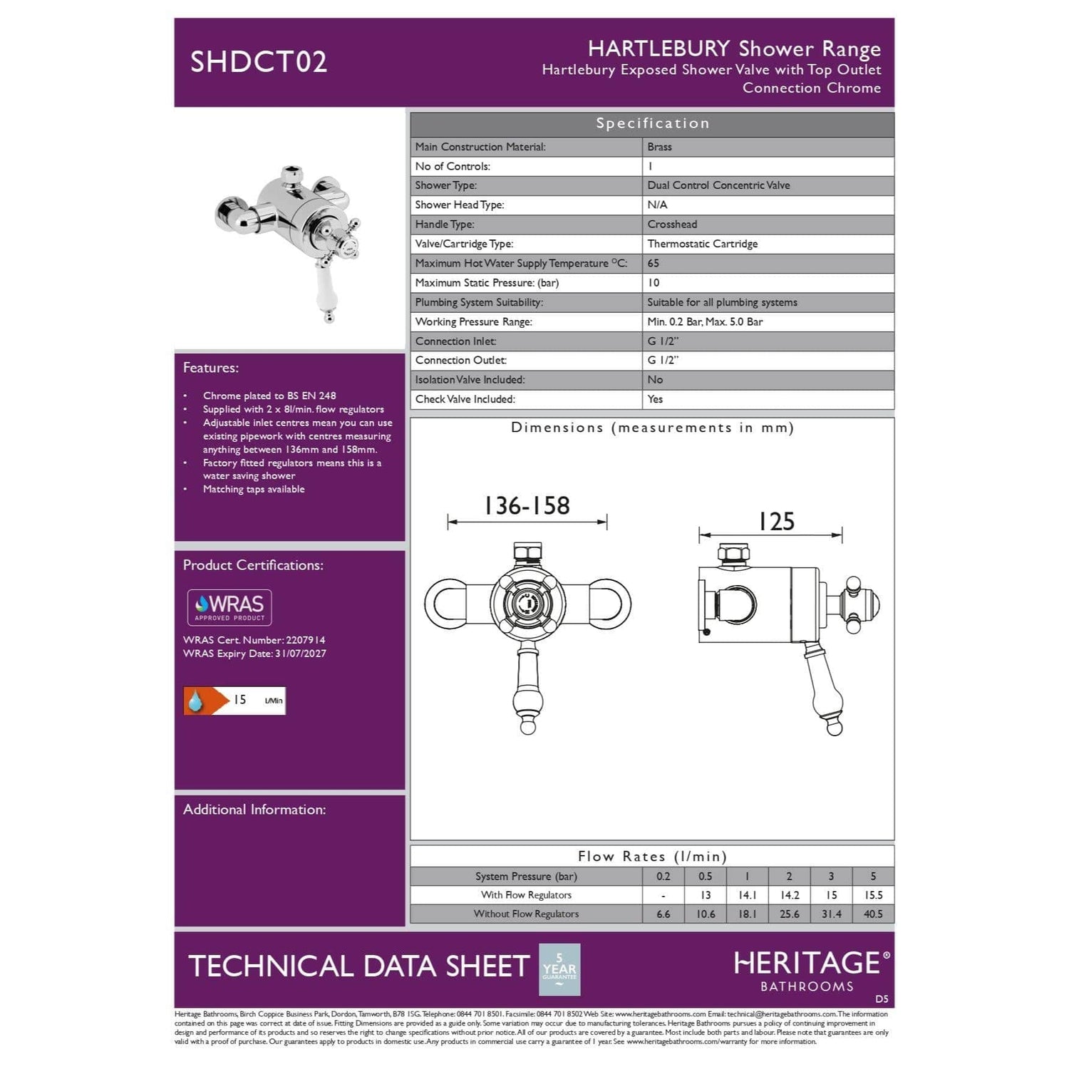 Curvaceous and elegant, taps and fittings from the Hartlebury Collection are a beautiful addition to a traditional bathroom space. This is a single outlet exposed valve with dual controls for separate flow and temperature adjustability. It has thermostatic temperature control and automatic stop to prevent surges of hot or cold water. Adjustable inlet centres, allowing you to use existing pipework with centres measuring anything between 136mm and 158mm.