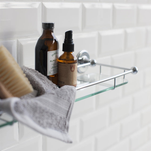 This wall mounted glass shelf from BURLINGTON adds the finishing touch to any traditional bathroom and adds a handy space to store your most used bathroom potions.