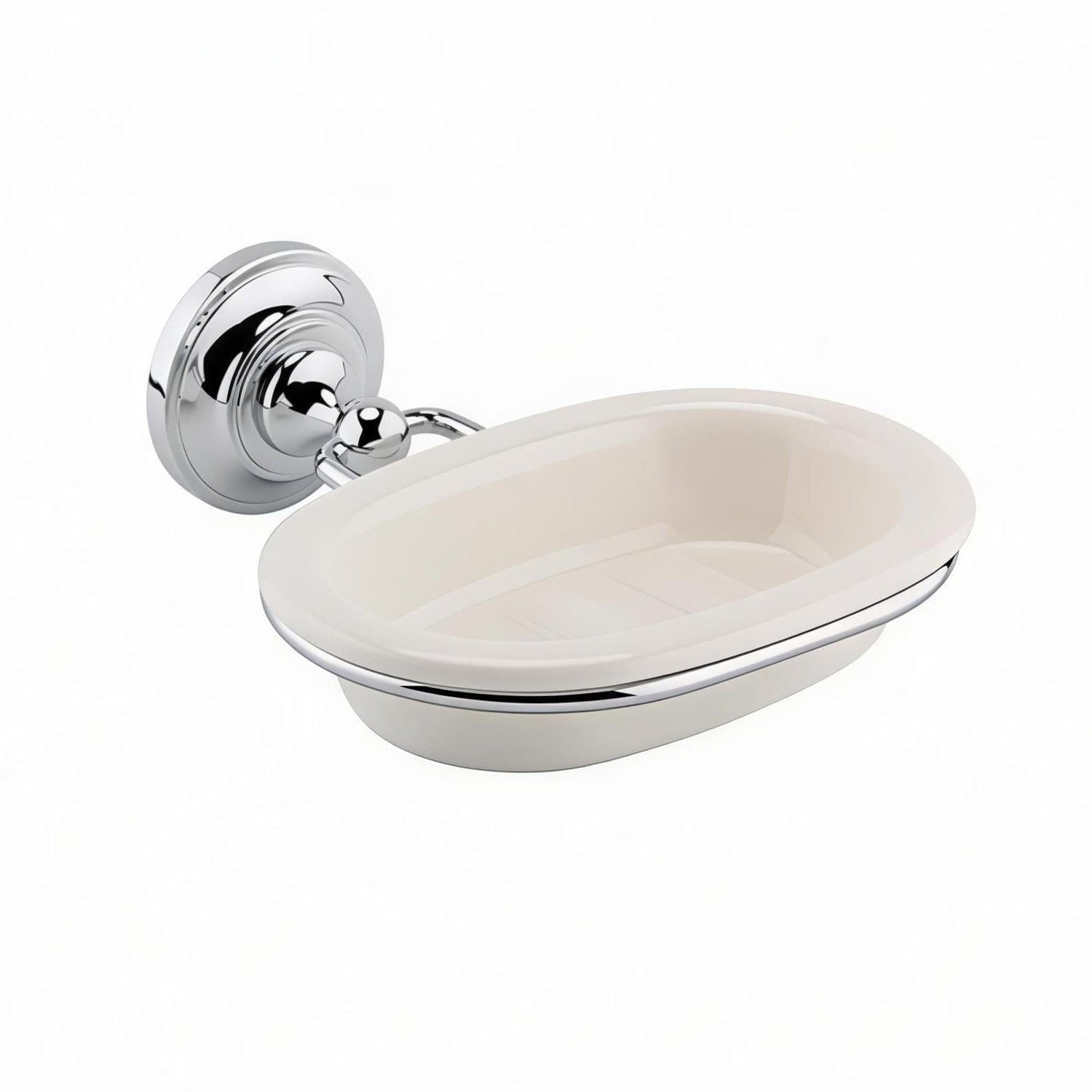 - Durable white ceramic soap dish with polished chrome holder
