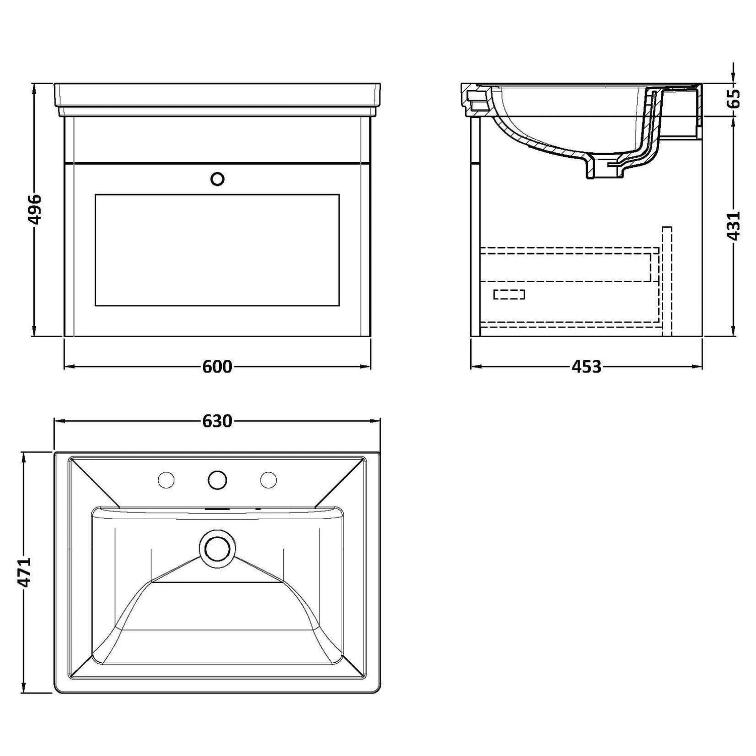 •  600mm wall mounted vanity unit – ideal for smaller bathrooms or cloakrooms
