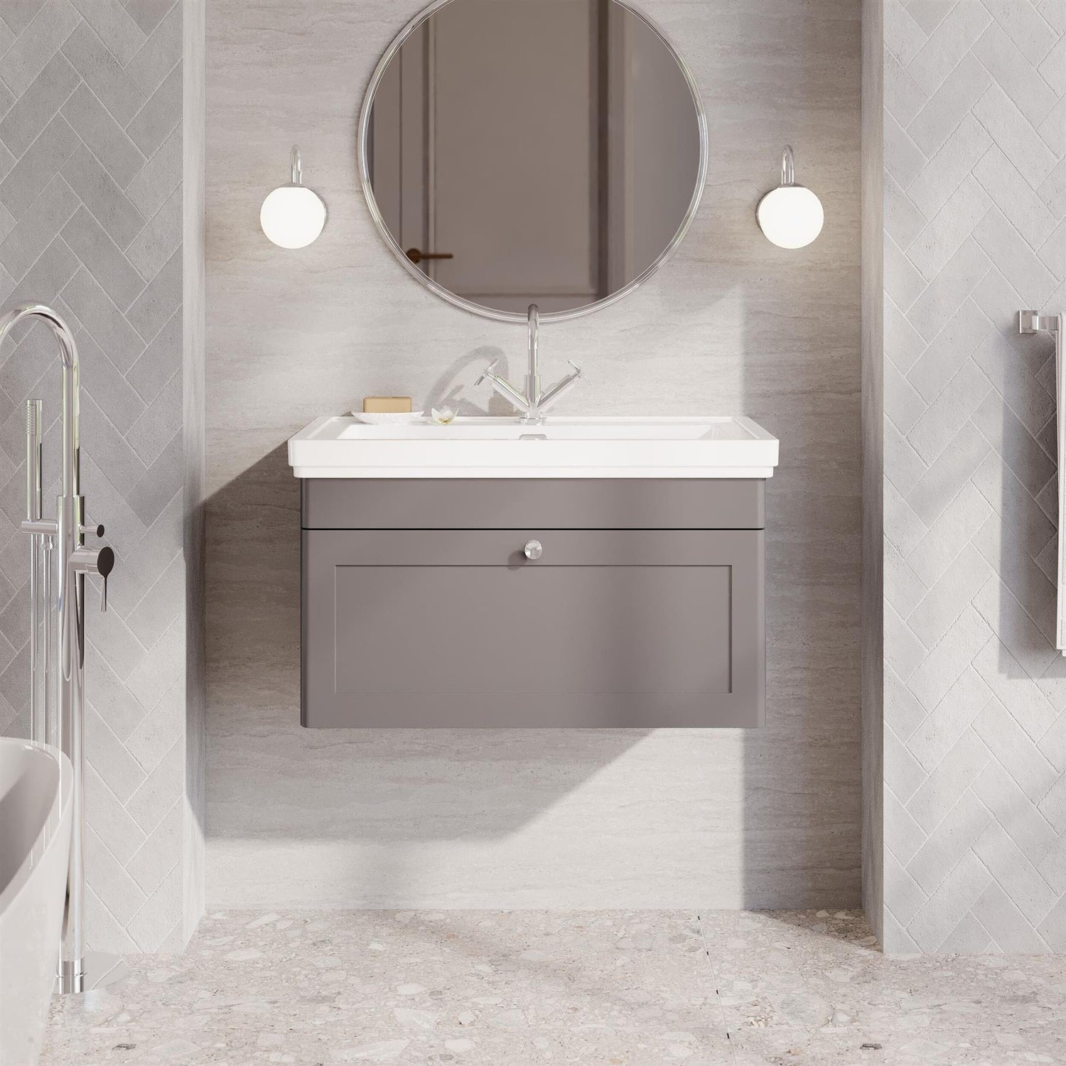Part of the beautifully crafted Leighton furniture collection from Aquarius Bathrooms, this 800mm wall mounted vanity unit with basin draws inspiration from the grandeur and refined detailing of traditional English stately homes. Classic styling is carefully blended with modern functionality, creating a timeless piece that suits both period and transitional bathroom designs.