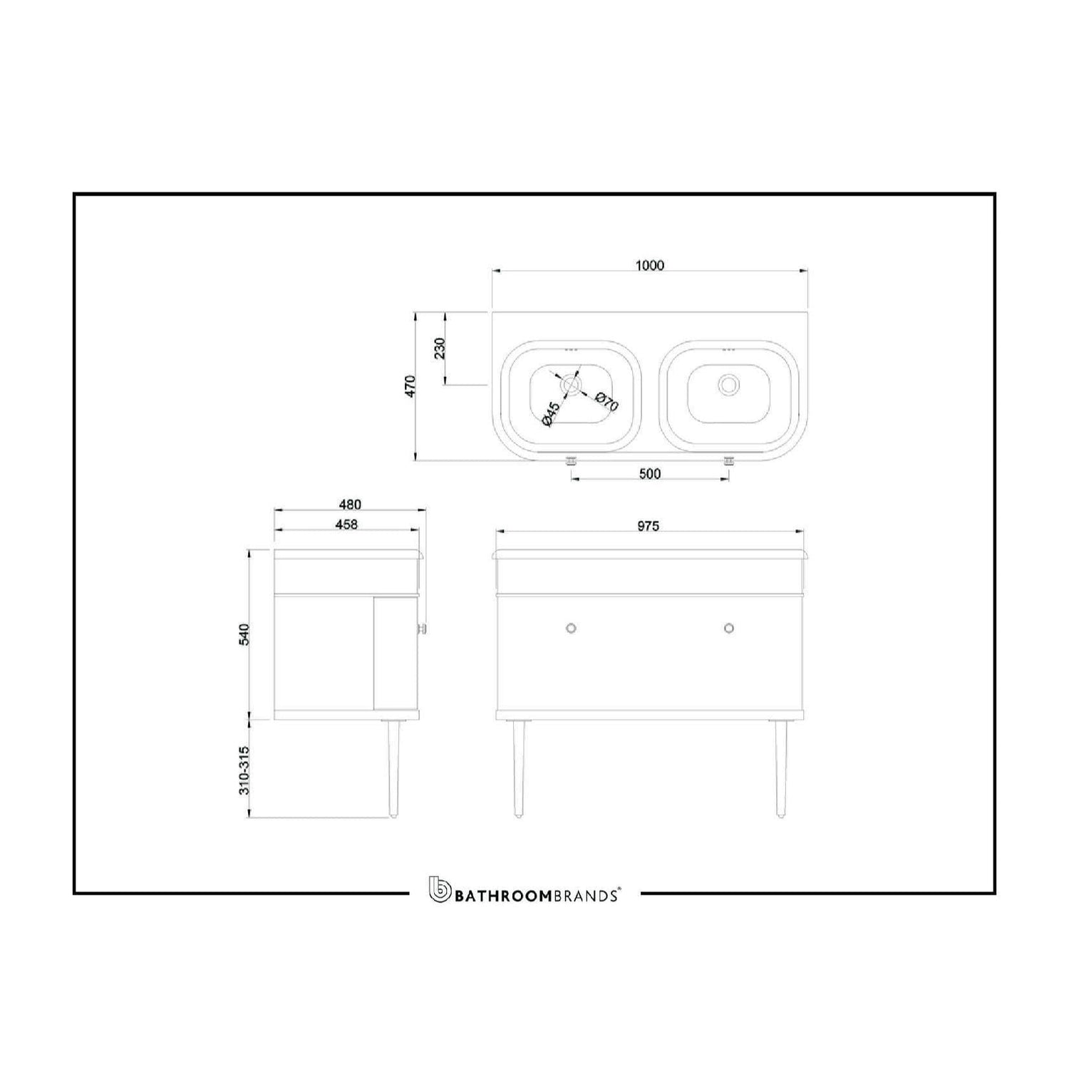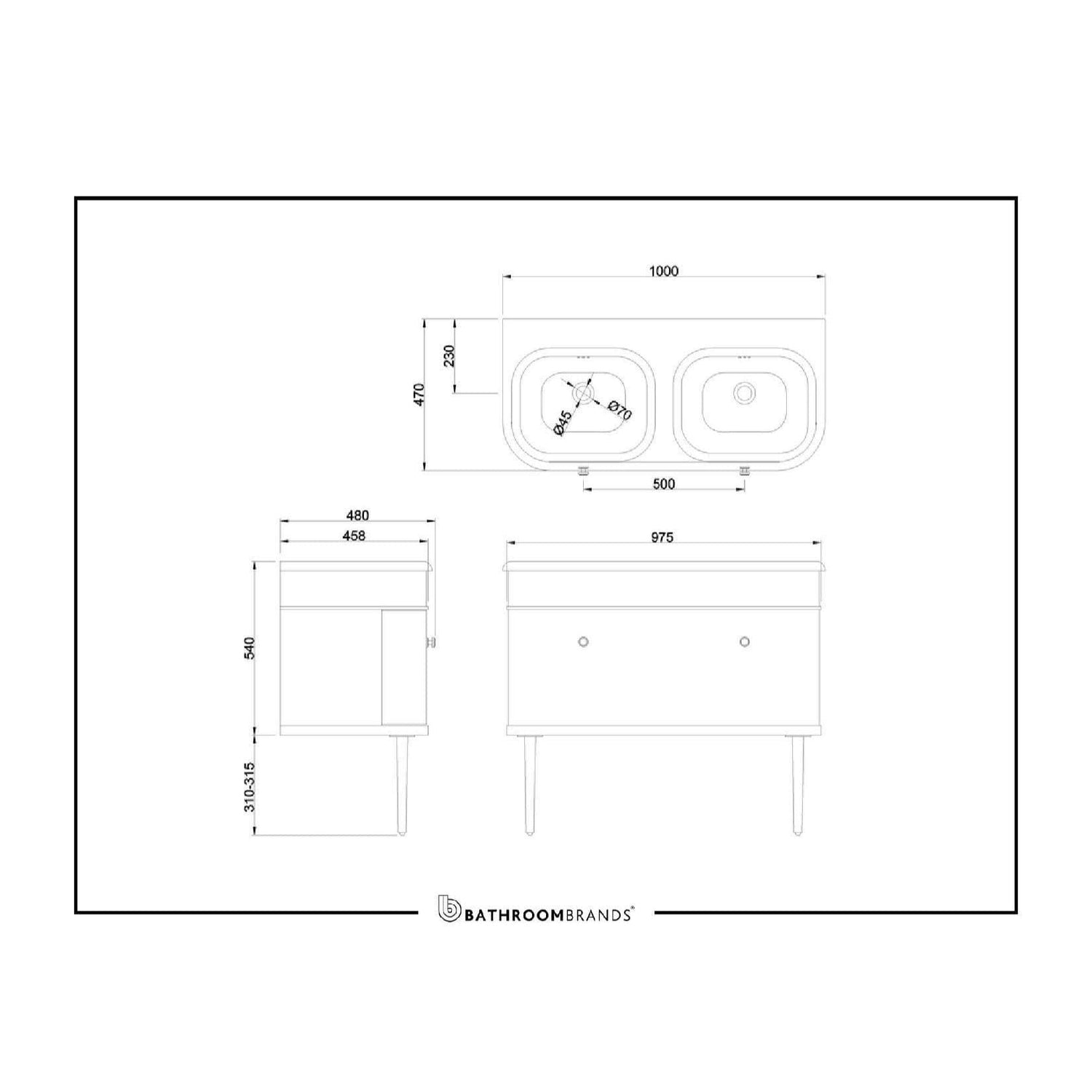 - Optional legs in 3 finishes to match your brassware.