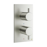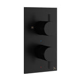 Vertical MPRO thermostatic concealed shower valve with two outlets and two handles, available six beautiful finishes - Brushed Brass, Brushed Bronze, Brushed Stainless Steel Effect, Chrome, Matt Black and Slate. Etched with shower/handset.