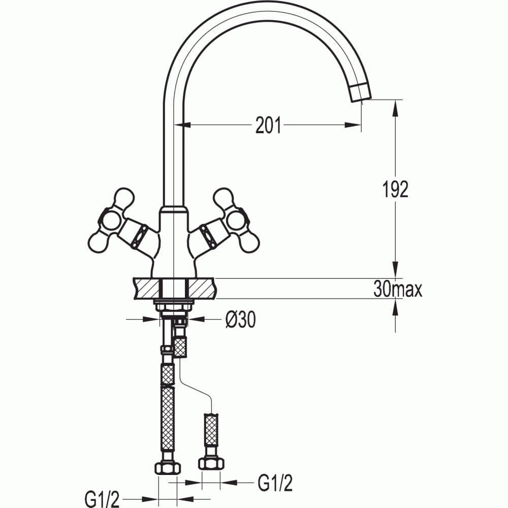 Elegance dual crosshead handle traditional kitchen mixer tap with swivel spout, available in a chrome finish.