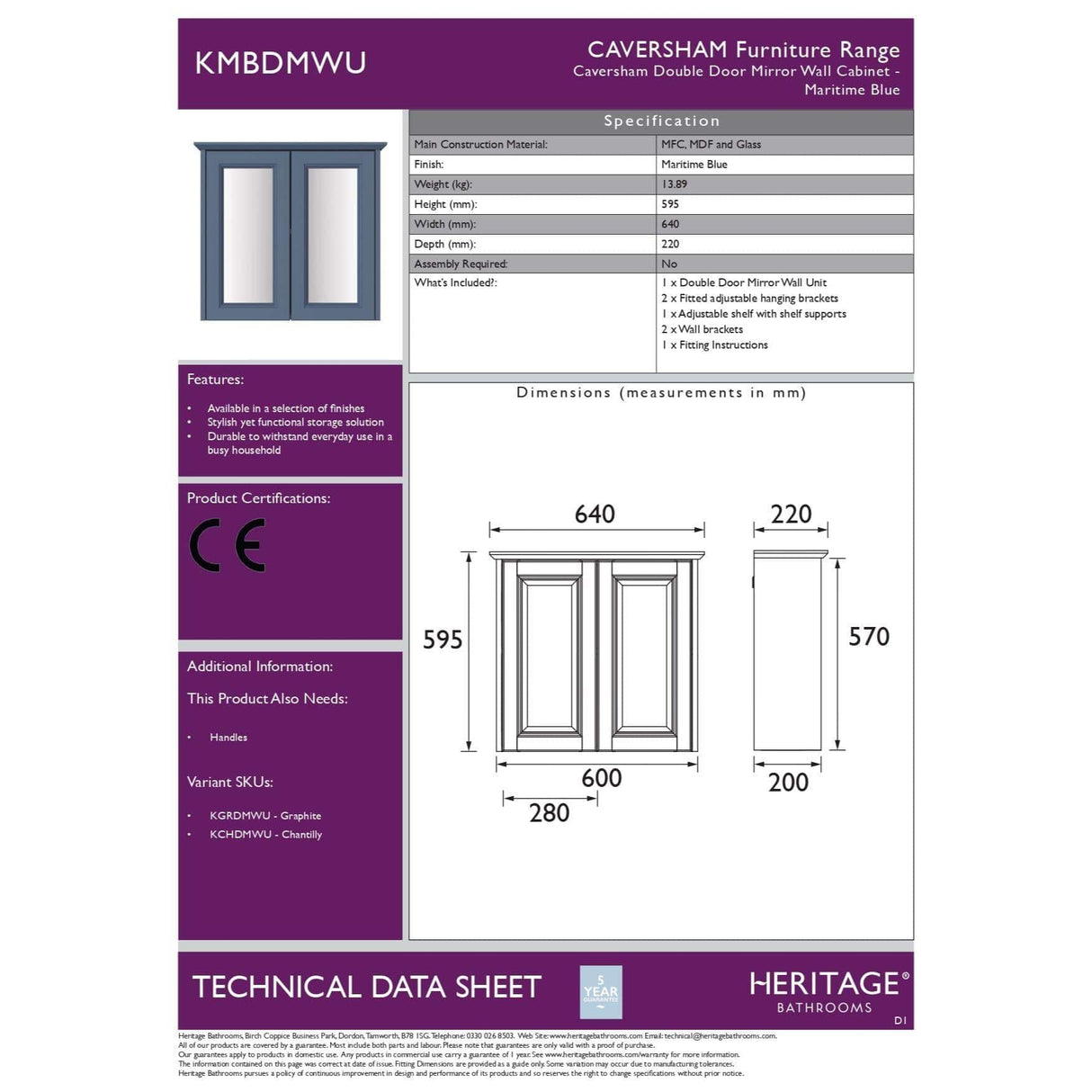The elegant Caversham collection from HERITAGE BATHROOMS features a simple style with beautifully muted colours - Chantilly, Graphite and Maritime Blue, with a wide selection of both wall mounted and floorstanding vanity units, with matching cabinets and mirrors.