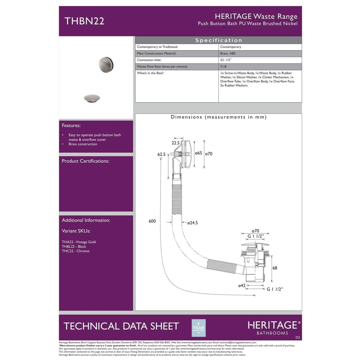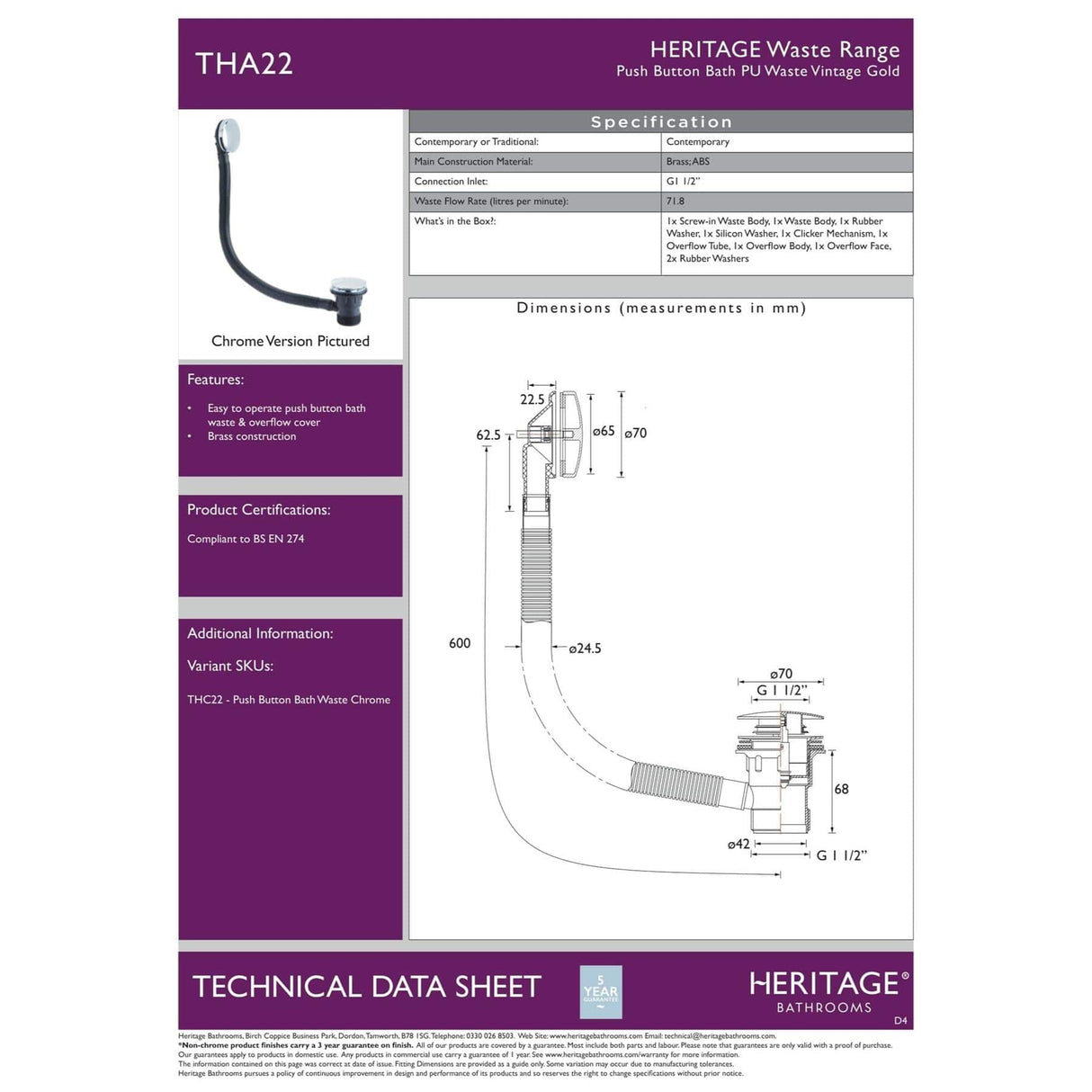 Add the perfect finishing touch to your HERITAGE bath with a Push Button (Clicker) bath waste and Overflow Kit.