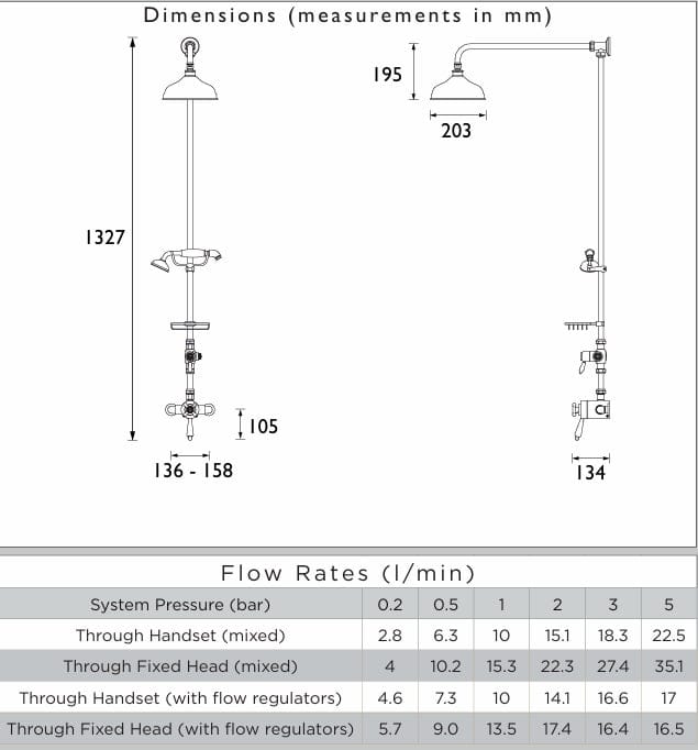 Glamorous in the detail, this shower pack contains a shower valve with rigid riser set, fixed shower head, handset and cradle, and soap basket. It has a thermostatic cartridge with preset temperature stop at 42c, and supplied with 2 x 8L/min flow regulators.