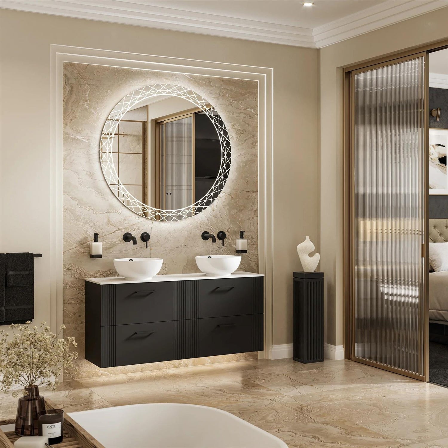 A contemporary approach to a timeless ornate mirror, Bellus from hib., with it's elaborate patterned illumination creates a striking feature, ideal for both modernist and classic bathroom settings.