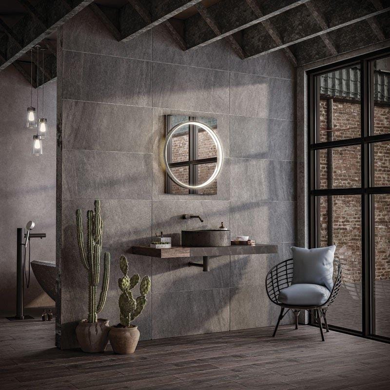 The circular LED light frame is available in chrome or brushed brass with mirrored sides, or in a cutting-edge industrial black. Solas can be hung landscape or portrait to suit your bathroom.