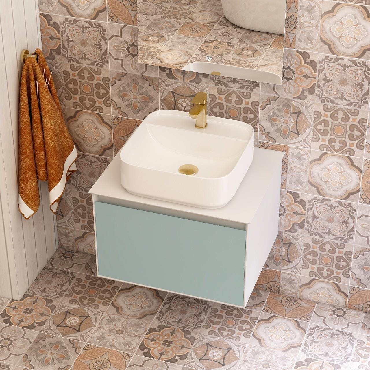 Add a touch of gentle colour to your bathroom with the beautifully designed Essence 600mm Wall Mounted Vanity Unit from IMEX. It has a modern minimalist look and comes complete with a solid white quartz worktop and elegant countertop basin. The floating design adds a clean, spacious feel while offering smart storage with a soft closing metal drawer.