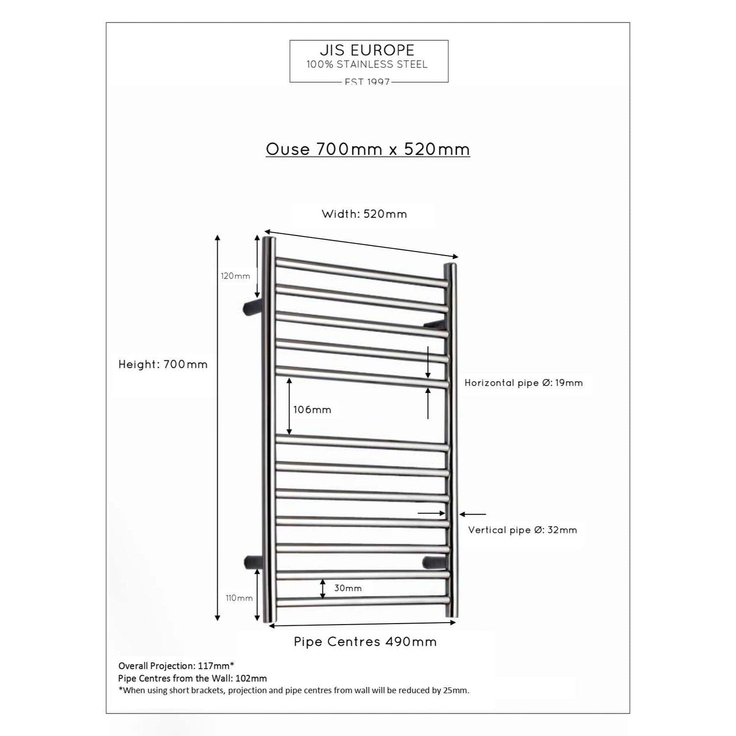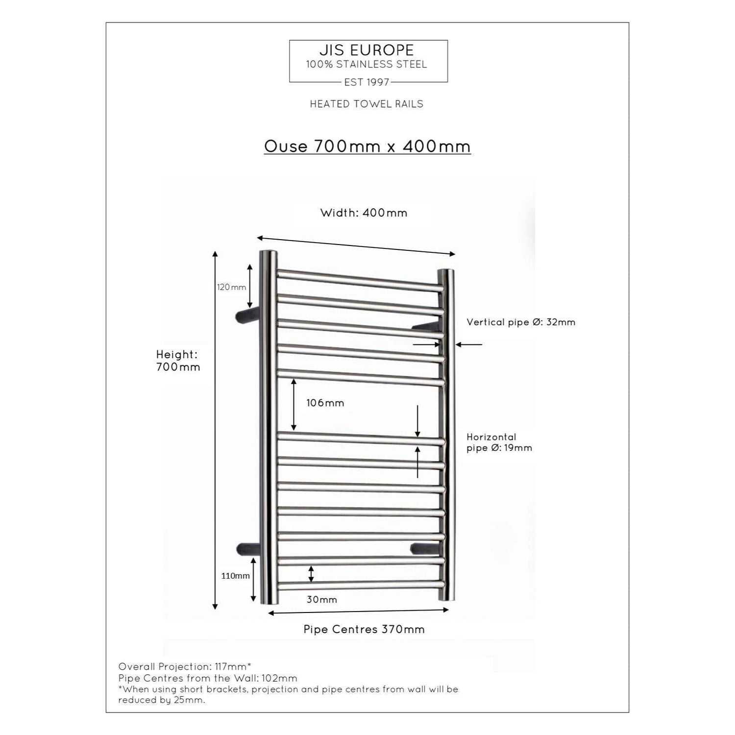 JIS Sussex Ouse Vertical Stainless Steel Heated Towel Rail