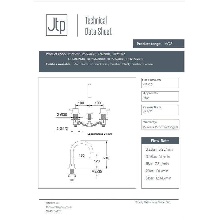 This listing is for JTP VOS 3 Hole Deck Mounted Basin Mixer Tap in Matt Black.