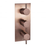 Vertical thermostatic concealed shower valve with three outlets and three handles.