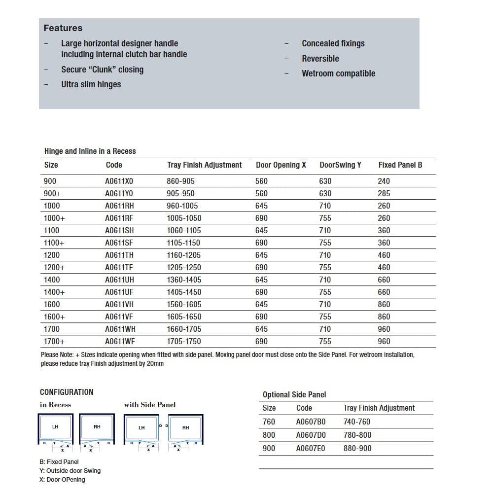 - 40mm adjustment in recess, 20mm with side panel
