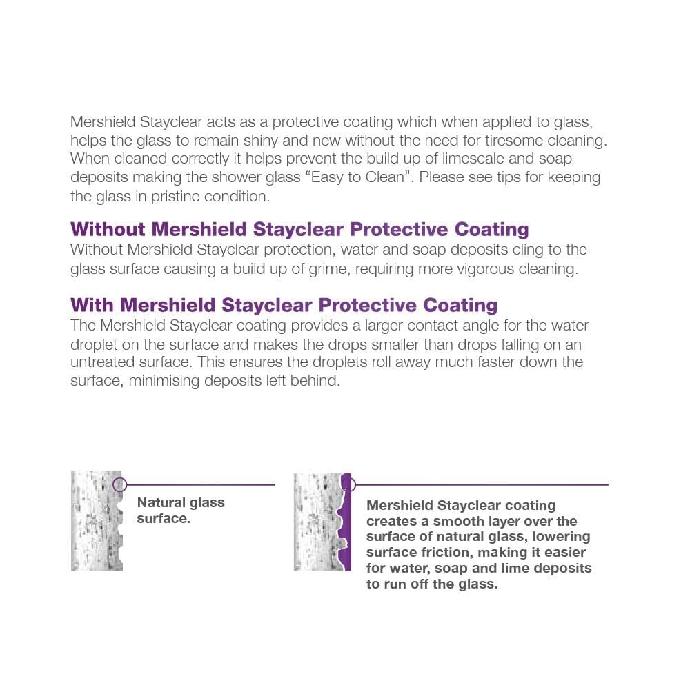 The Mershield coating is applied to all glass in this range to help maintain a clearer finish. Without protection, soap and limescale can cling to microscopic imperfections in the glass, causing visible build-up over time. Mershield forms a smooth, protective layer that prevents dirt, soap and water from sticking, allowing moisture to bead and run off easily — reducing cleaning time and keeping the screen looking newer for longer