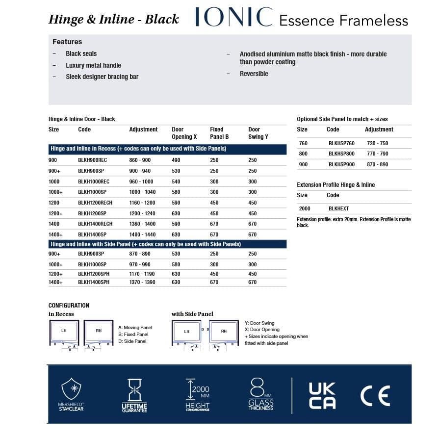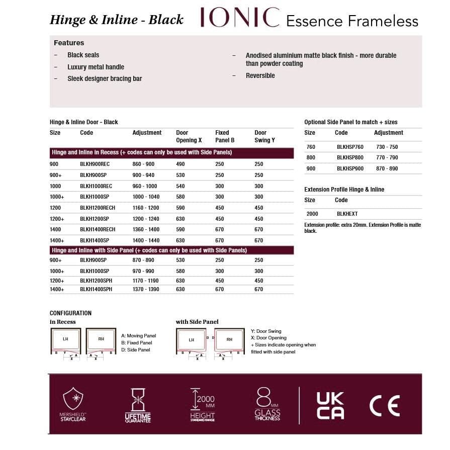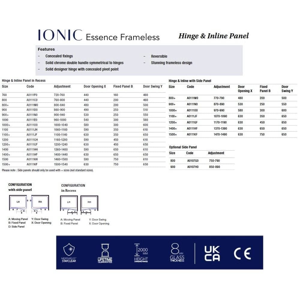 MERLYN Showers Ionic Essence Framless Hinged Shower Door with Inline Panel create a truly minimalistic showering space. Built with 8mm safety glass and coated in MerShield Stayclear protective coating, they contain a wealth of feaures for a superior product. These doors can be fitted into a recess or as a corner installation when purchased with a side panel but only plus code models are compatible with side panels.