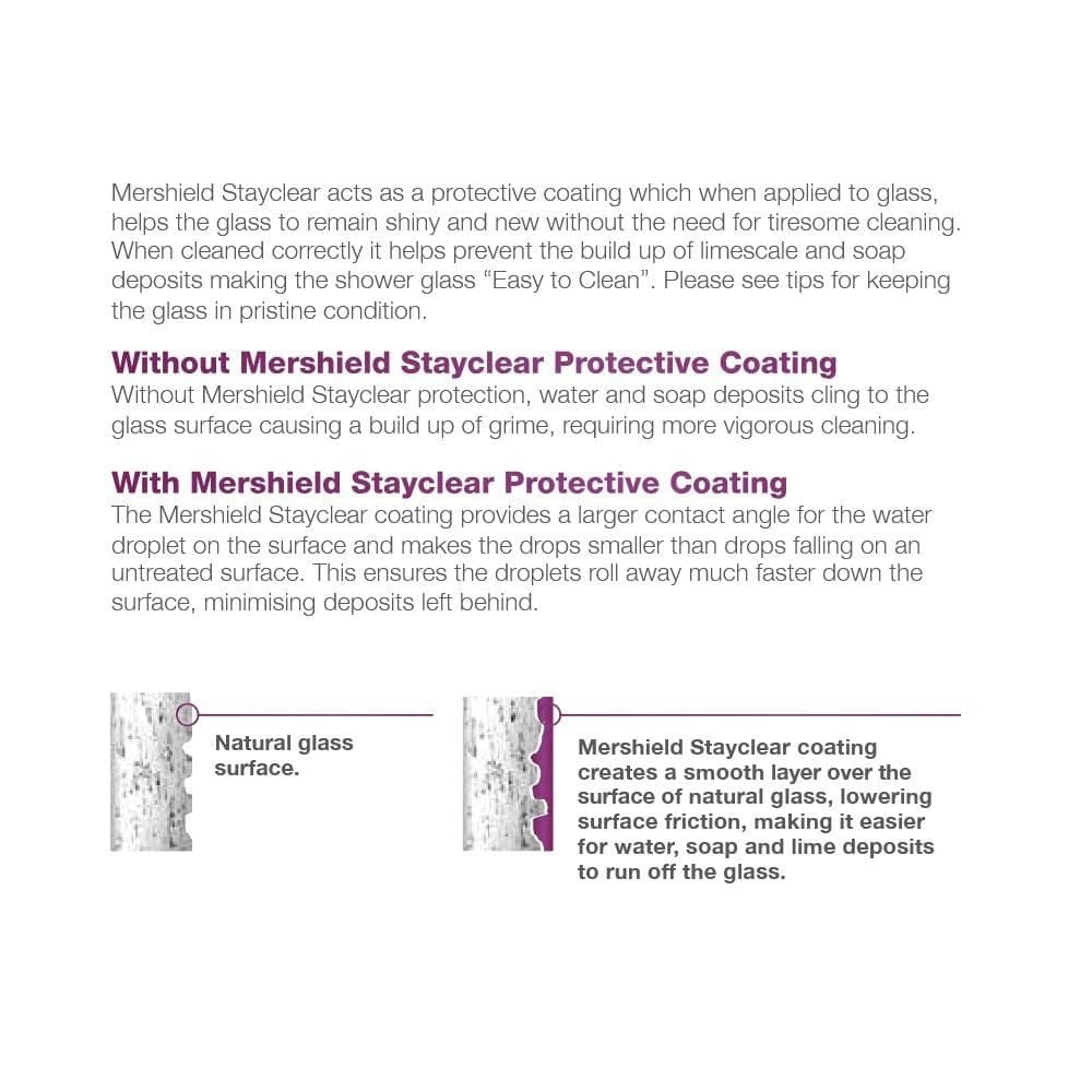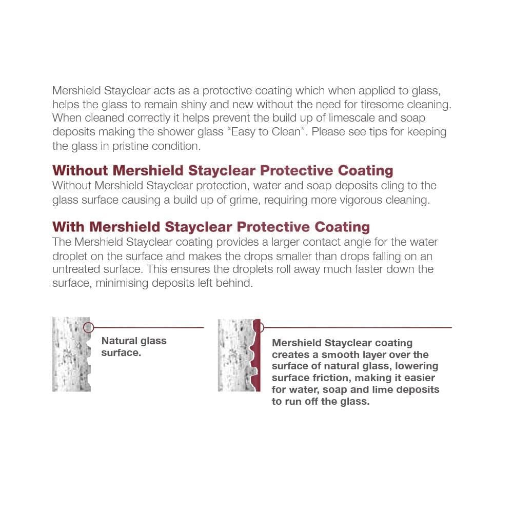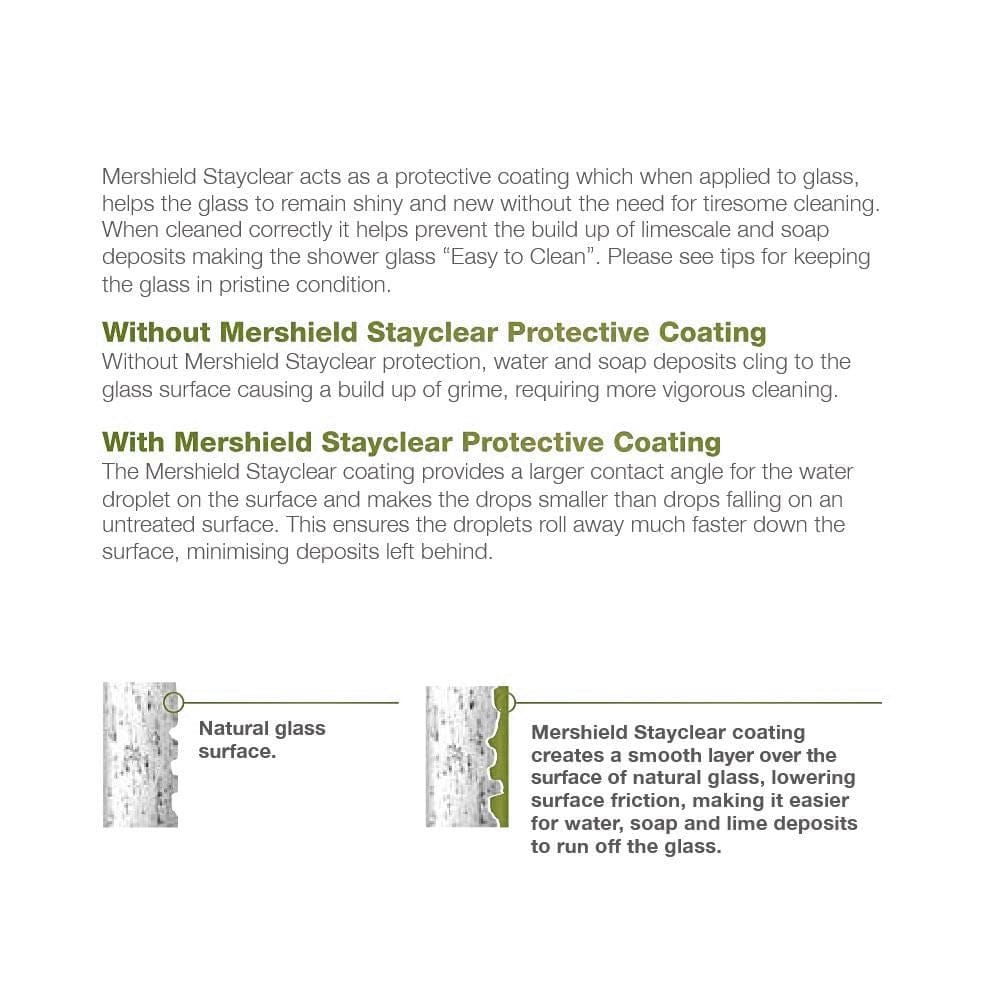 The Mershield coating is applied to all glass in this range to help maintain a clearer finish. Without protection, soap and limescale can cling to microscopic imperfections in the glass, causing visible build-up over time. Mershield forms a smooth, protective layer that prevents dirt, soap and water from sticking, allowing moisture to bead and run off easily — reducing cleaning time and keeping the screen looking newer for longer