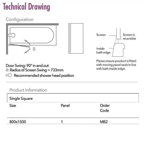 Standing 1500mm high and offering a generous 800mm width, the screen provides ample showering space while maintaining a sleek, minimalist look. Fully reversible for left or right-hand installation, it features a polished bright chrome profile and a smooth 90-degree swing in and out of the bath for ease of use.