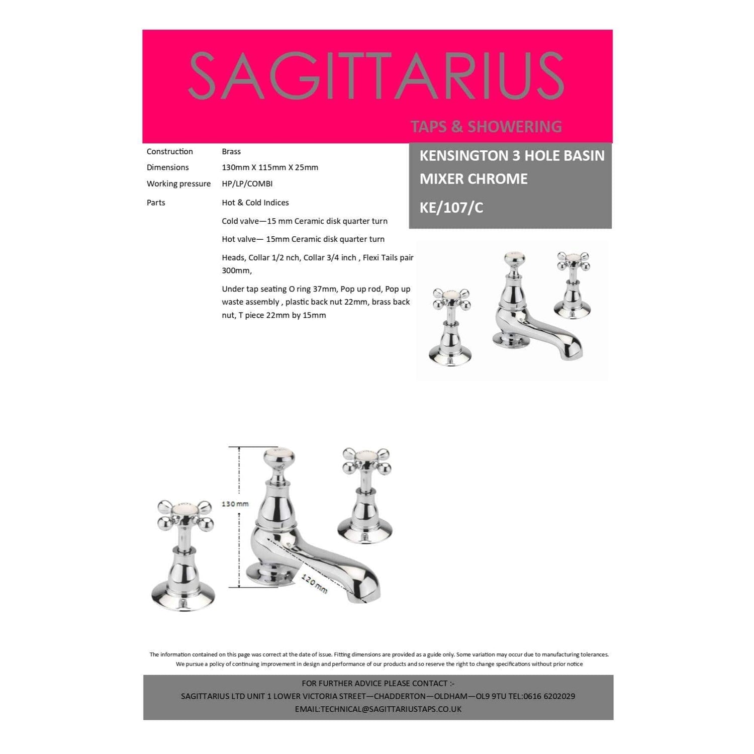 Bring a timeless style to your bathroom with the Sagittarius Kensington 3-hole basin mixer. Featuring classic crosshead handles, a curved spout, and a polished chrome finish with white ceramic accents, it’s perfect for traditional spaces. Made from solid brass with smooth ceramic disc technology and includes a pop-up waste for added convenience. Suitable for low and high pressure systems.